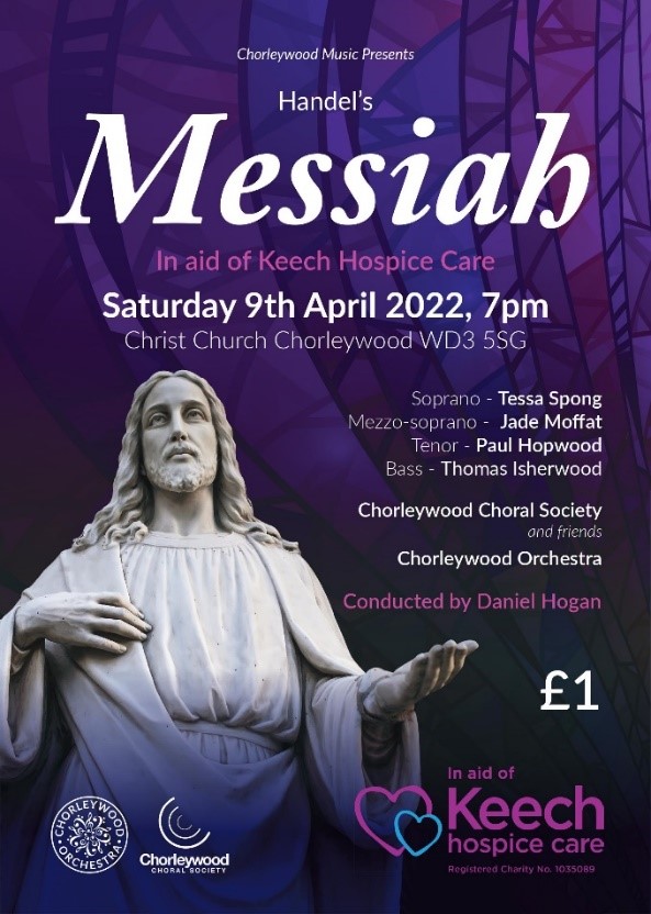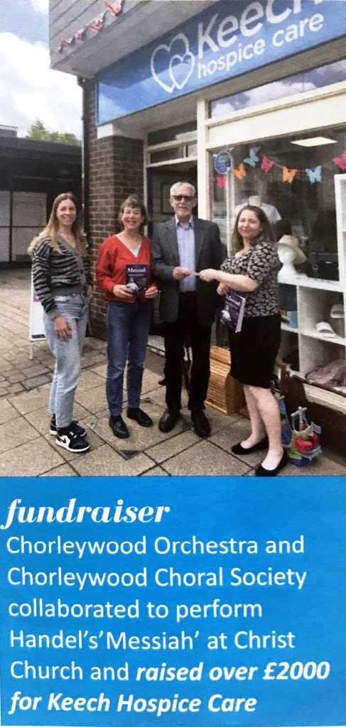 In April 2022, CCS performed its first ever concert with Chorleywood Orchestra under the baton of guest conductor, Daniel Hogan. Together, choir, soloists and orchestra gave a memorable performance of Handel’s Messiah in Christ Church, Chorleywood, raising a magnificent £2000 for Keech Hospice through ticket sales and local sponsorship. We were particularly grateful to the professional soloists who so generously supported this charitable event.