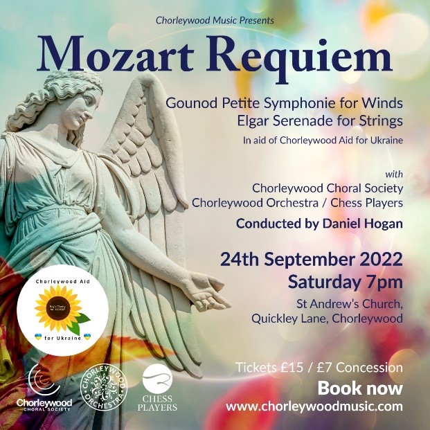 In late September 2022, CCS and friends reunited with Chorleywood Orchestra to perform Mozart’s Requiem in St. Andrew’s Church, Chorleywood. The choir, local young soloists and musicians were conducted once more by Daniel Hogan, now in his capacity as the orchestra’s new Music Director. The concert was another fundraising event; this time for the local Chorleywood Aid for Ukraine (CAFUKR) charity. Through a combination of ticket sales, refreshments, a tombola stall and contributions from participating singers and musicians, the concert raised an impressive total of £1510. At the end of the evening, Pierre Bosdet Chair of the charity gave a closing vote of thanks and updated the audience on how donations would be utilised to support those affected by the war in Ukraine.